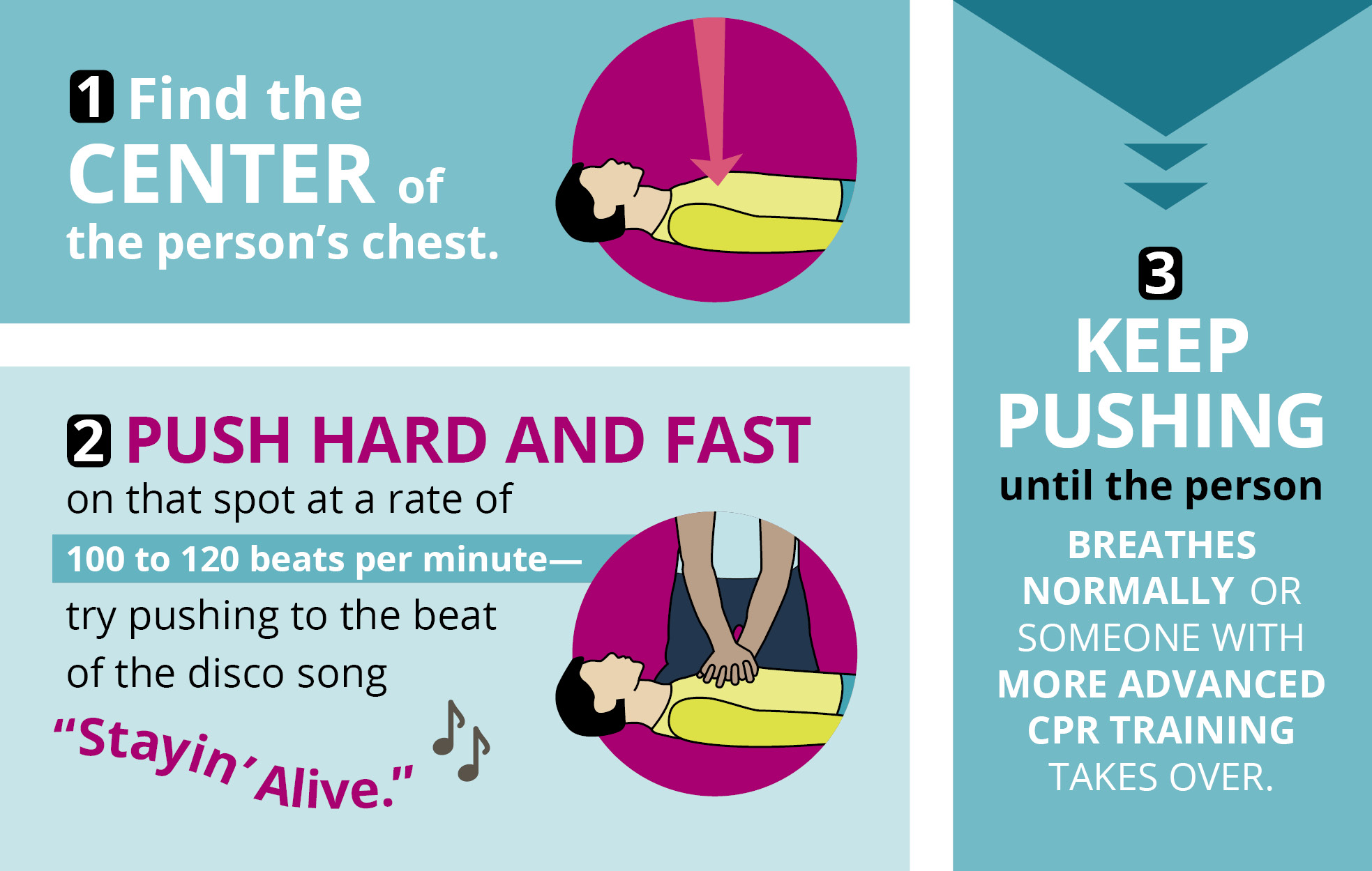- Push hard and fast on that spot at a rate of 100 to 120 beats per minute—try pushing to the beat of the disco song "Stayin' Alive."